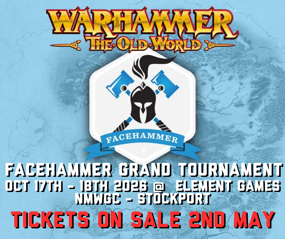 Welcome to the FaceHammer Grand Tournament, a 5 game, 60 player Warhammer the OLD WORLD event using the Matched Play guide hosted at Element Games Northwest gaming center on the 17th and 18th of October!